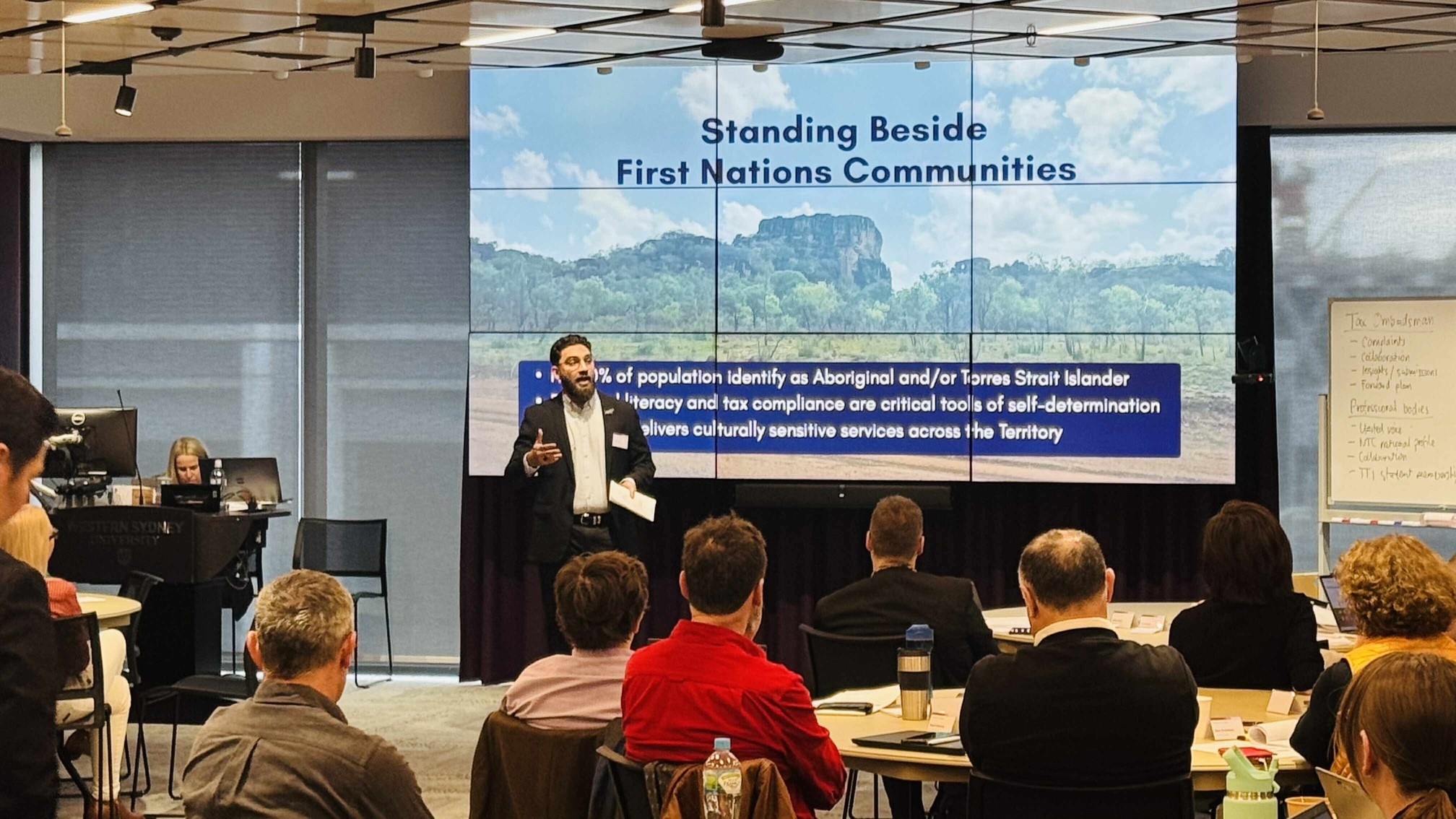 CDU Free Tax Clinic’s management team, Raul David (Program Director) and Supervisors – Ali Dhirani and Manfred Mletsin, presented their work at the 2025 National Tax Clinics Conference in Sydney. In the photo presenting - Ali Dhirani.